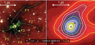 Cuando ello ocurre, según revela el estudio, se produciría la acreción de unas 700 masas solares hacia una región compacta, lo que, de acuerdo a los resultados, se trataría de un cúmulo de estrellas masivas.